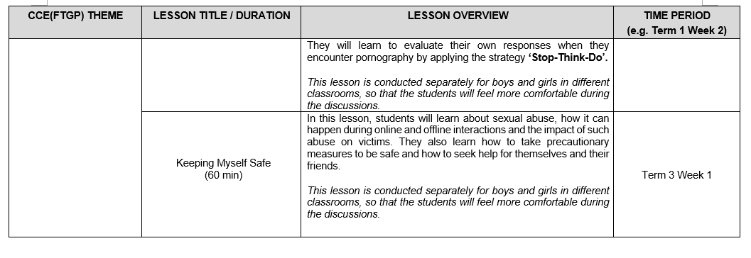 7. Sexuality Education (SEd) lessons are taught as part of CCE (FTGP) at Primary 5 and 6. Through these lessons, students will learn healthy ways to manage the physiological, social and emotional changes in their growing years. They learn to build healthy and rewarding relationships with others, including those with members of the opposite sex. Students are also guided to make wise, informed and responsible decisions to keep themselves safe from sexuality-related risks.